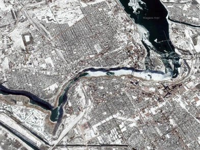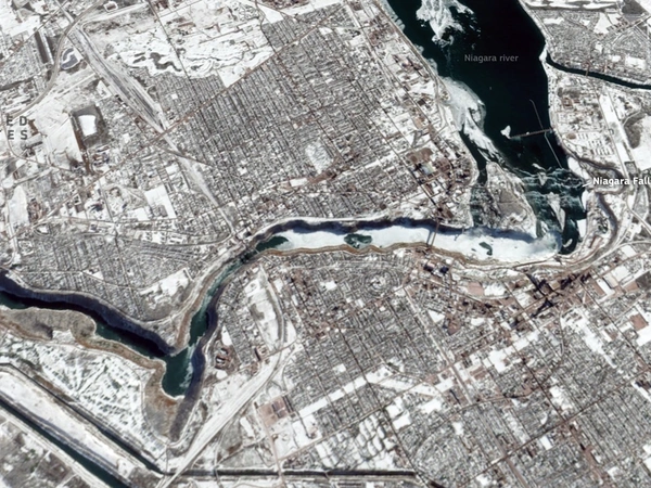 Μία άλλη άποψη του εμβληματικού φυσικού μνημείου μας δίνουν πλάνα του δορυφόρου Copernicus, στα οποία ο Νιαγάρας φαίνεται κατά μέρος παγωμένος, με τις όχθες του να έχουν «βαφτεί» άσπρες.