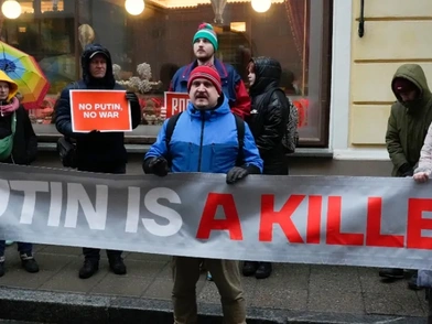 Στην πρωτεύουσα της Εσθονίας στο Ταλίν, διαδηλωτές κρατούν πανό που γράφει «Ο Πούτιν είναι δολοφόνος».