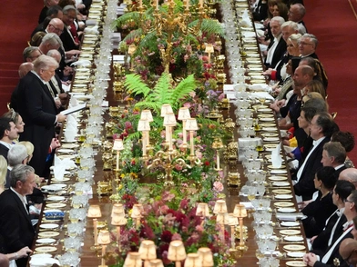 Στο εντυπωσιακό δείπνο, ο Τραμπ και η σύζυγός του Μελάνια φιλοξενήθηκαν από τον βασιλιά Κάρολο, τον πρίγκιπα Γουίλιαμ και την πριγκίπισσα Κέιτ, περιτριγυρισμένοι από δεκάδες υψηλόβαθμους επιχειρηματίες και διπλωμάτες και από τις δύο πλευρές του Ατλαντικού.