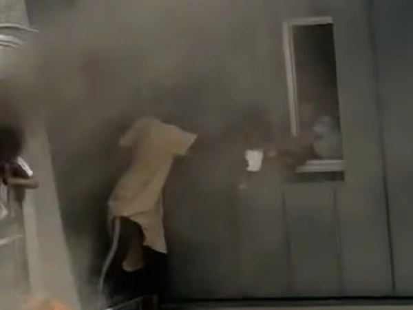 Το βίντεο τον δείχνει να στέκεται δίπλα στο παράθυρο, γεμάτο μαύρο καπνό, κάνοντας σήμα σε όσους βρίσκονται μέσα να του δώσουν τα παιδιά. Κι όλα αυτά, ισορροπώντας σε ένα στενό περβάζι.