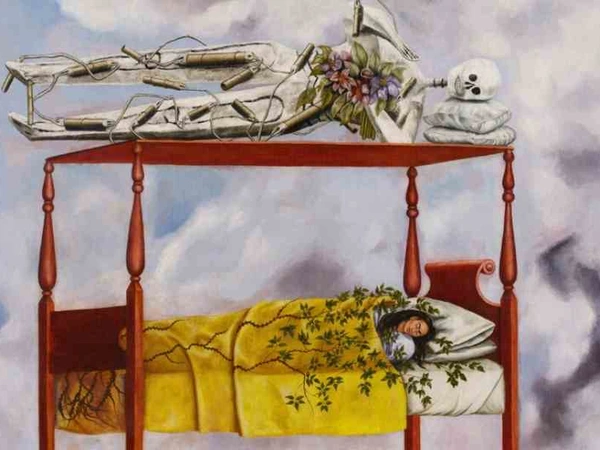 Στον πίνακα, η Φρίντα Κάλο εικονίζεται να κοιμάται σε ξύλινο κρεβάτι αποικιακού στιλ που μοιάζει να ίπταται στον ουρανό, ενώ στην οροφή του κρεβατιού της είναι ξαπλωμένος σκελετός, τυλιγμένος με μασούρια δυναμίτη, με ανθοδέσμη στο χέρι και κάτι σαν χαμόγελο.