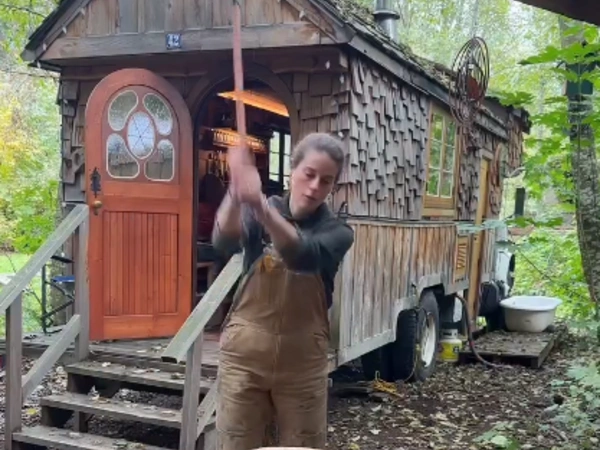 Η ίδια κοιμάται στη σοφίτα, ενώ κάνει μπάνιο έξω καθώς το ντους είναι υπαίθριο, προς το παρόν μιας και τώρα κατασκευάζει και την ντουζιέρα της. Μέσα στο σπιτάκι έχει έναν καναπέ και μια μικρή ξυλόσομπα για να ζεσταίνει το χώρο.