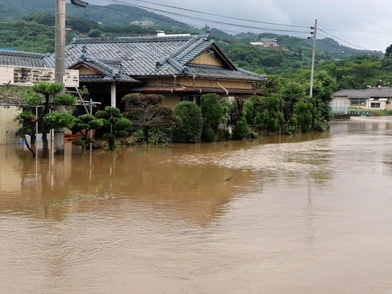 Τηλεοπτικά πλάνα δείχνουν πλημμυρισμένες περιοχές στον νομό Κουμαμότο, όπου σπίτια, καταστήματα και οχήματα έχουν καλυφθεί από νερά που φτάνουν περίπου στο ένα μέτρο.