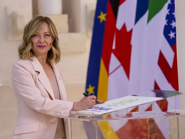 Αυτή την εικόνα σκετσάρει τουλάχιστον το Politico, παρατηρώντας την εξόφθαλμη έλλειψη...πολιτικής ισχύος στο φετινό lineup. Πέρα από τη Μελόνι, έχουμε τους Τζο Μπάιντεν (ΗΠΑ), Εμμανουέλ Μακρόν (Γαλλία), Όλαφ Σόλτς (Γερμανία), Τζάστν Τρουντό (Καναδάς), Ρίσι Σούνακ (Βρετανία) και Φουμίο Κισίντα (Ιαπωνία).
