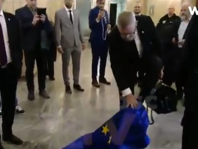 Ο Μπράουν αυτή τη φορά κατέβασε τη σημαία της Ευρωπαϊκής Ένωσης και σκούπισε επιδεικτικά τα παπούτσια του με αυτήν.