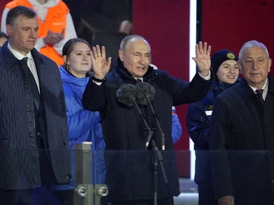 Είχε προηγηθεί φιέστα κατά την οποία γιορτάστηκε η προσάρτηση της Κριμαίας, με τον ίδιο τον Πούτιν να αναφέρει ότι επέστρεψε στην πατρίδα της. Από την ομιλία του δεν έλειψαν και οι αναφορές στο Ντονμπάς και στον πόλεμο στην Ουκρανία.