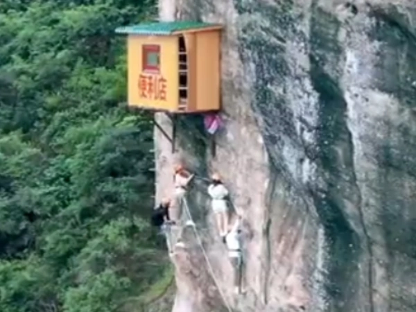 Το 2 τ.μ. κατάστημα βρίσκεται σε ύψος 120 μέτρων από το έδαφος στην επαρχία Χουνάν και εφοδιάζει ορειβάτες με νερό κι άλλα δροσιστικά ποτά.