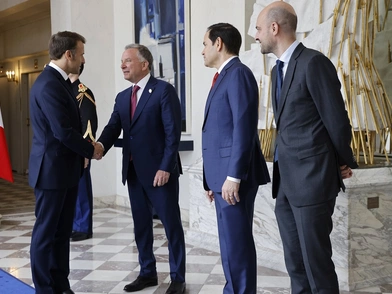 Μετά τη συνομιλία με τον Ζελένσκι, ο Μακρόν υποδέχτηκε τον Γουίτκοφ και κατόπιν τον Ρούμπιο για γεύμα εργασίας. Τους χαιρέτισε δια χειραψίας, όχι όμως και με τις θερμές αγκαλιές και τα χτυπηματάκια στην πλάτη που συνηθίζει.