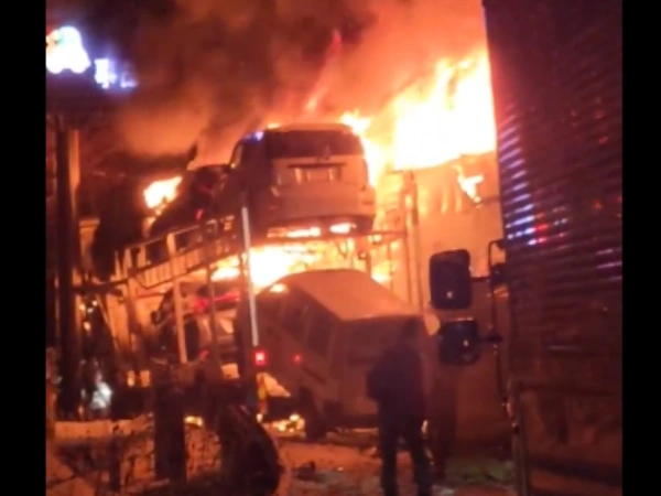 Βίντεο που αναρτήθηκαν στα μέσα κοινωνικής δικτύωσης καταγράφουν ισχυρή έκρηξη και εκδήλωση μεγάλης πυρκαγιάς, με οχήματα να τυλίγονται στις φλόγες και πυκνούς μαύρους καπνούς να καλύπτουν την περιοχή.