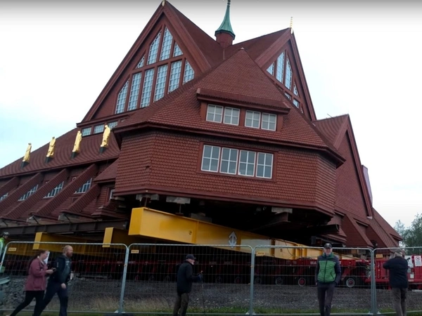 Η τεράστια κόκκινη ξύλινη κατασκευή στην κοινότητα του Κιρούνα, που χρονολογείται από το 1912 έχει ανυψωθεί σε γιγάντιες κυλιόμενες πλατφόρμες ενόψει της μετακόμισης στο νέο κέντρο της πόλης.