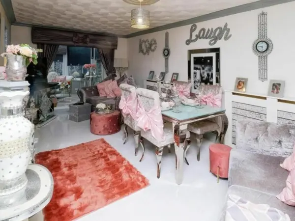 Πρόκειται για ένα σπίτι τριών υπνοδωματίων, του οποίου η τιμή πώλησης είναι 180.000 λίρες και με μια ματιά στις φωτογραφίες της αγγελίας μπορεί να διακρίνει κανείς -μεταξύ άλλων- τα βελούδινα έπιπλα διαφόρων χρωμάτων σε όλα τα δωμάτια, το chanel χαλί στην κουζίνα, τις μωβ κορδέλες.