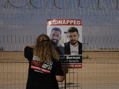 Οι συγγενείς ορισμένων από τους 107 ομήρους που κρατούνται ακόμη στη Γάζα, κρατώντας φωτογραφίες των δικών τους ανθρώπων και φορώντας μπλουζάκια με στίγματα κόκκινης μπογιάς, συγκεντρώθηκαν στο Κιμπούτς Νιρίμ, στο νότιο Ισραήλ, που απέχει περίπου 2 χιλιόμετρα από τα σύνορα.