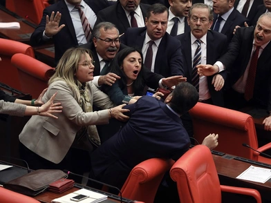 «Άναψαν τα αίματα» στην τουρκική Εθνοσυνέλευση, όταν οι βουλευτές του φιλοκουρδικού Κόμματος Δημοκρατίας και Ισότητας των Λαών (DEM) κατέθεσαν πρόταση για κοινοβουλευτικό έλεγχο και προχώρησαν σε διαμαρτυρία μπροστά στην έδρα, υψώνοντας πλακάτ για την καθαίρεση του εκλεγμένου με το DEM δημάρχου της επαρχίας Χακιάρι και την αντικατάστασή του από το υπουργείο Εσωτερικών από τον διορισμένο νομάρχη.