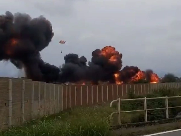 Στο βίντεο φαίνεται ο πιλότος να εκτινάσσεται με αλεξίπτωτο λίγο πριν από τη σύγκρουση μέσα σε ένα αεροδρόμιο με φράχτη.