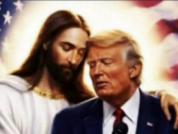 Η εικόνα, που αναδημοσιεύθηκε στον λογαριασμό του στο Truth Social, δείχνει τον Τραμπ με κλειστά μάτια να ακουμπά μέτωπο με μέτωπο με τον Ιησού. Ο Τραμπ τοποθετείτε πίσω από μικρόφωνο, ενώ ευδιάκριτη είναι και η αμερικανική σημαία.
