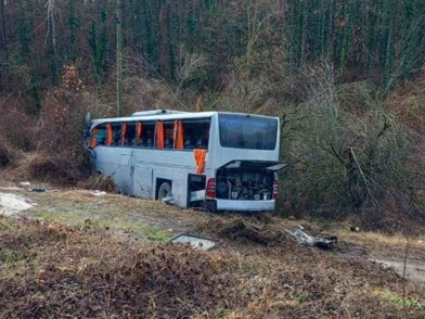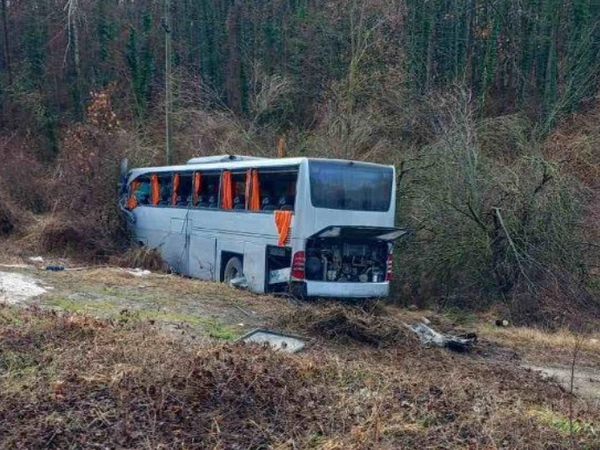 Κοντά στον κόμβο για την πόλη Μπόροβο της Βουλγαρίας, το πούλμαν συγκρούστηκε με φορτηγό, βγήκε από τον δρόμο και κατέληξε σε χαντάκι πέφτοντας σε συστάδα δέντρων.