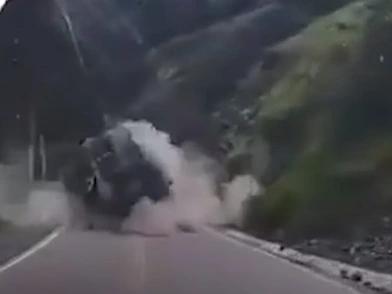 Η εσωτερική κάμερα ενός φορτηγού κατέγραψε τις στιγμές καθώς μία καταρρακτώδης κατολίσθηση πλάκωσε διερχόμενο όχημα, στιγμές προτού παρασύρει το ίδιο, με μία σειρά τεράστιων ογκόλιθων που αποκολλήθηκαν και κατρακύλησαν από διπλανό βουνό.