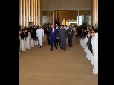 Κατά την άφιξή του στο Qasr Al Watan - το προεδρικό μέγαρο των ΗΑΕ - ο Τραμπ έγινε δεκτός με μια παραδοσιακή παράσταση Al-Ayyala, μια μορφή πολιτιστικής τέχνης από το Σουλτανάτο του Ομάν και τα ΗΑΕ, η οποία περιλαμβάνει γυναίκες να κουνούν δεξιά, αριστερά τα μαλλιά τους.