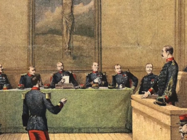 Ο Άλφρεντ Ντρέιφους συλλαμβάνεται και ακολουθεί η δίκη στην οποία ο στρατηγός Μερσιέ σε μια κατάφωρη προσπάθεια κατάχρησης εξουσίας παραδίδει στο στρατοδικείο ένα μυστικό φάκελο που περιελάμβανε κάποια προσεκτικά επιλεγμένα έγγραφα ντοκουμέντα που έδειχναν την σχέση του Ντρέιφους με τον Γερμανό ακόλουθο. Ο Ντρέιφους καταδικάζεται σε καθαίρεση του βαθμού του και σε ισόβια κάθειρξη απομόνωσης σε στρατιωτικό φρούριο. Έτσι, στέλνεται εξόριστος στο Νησί του Διαβόλου στην Γαλλική Γουιάνα.