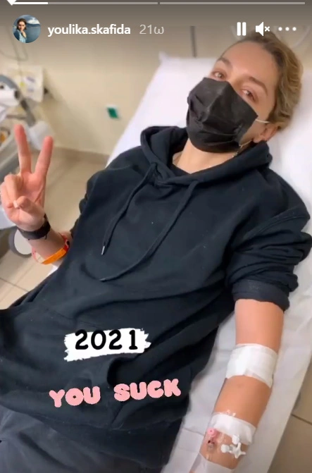 Η Γιούλικα Σκαφιδά αρχικά δημοσίευσε μια φωτογραφία από το κρεβάτι του νοσοκομείου, όπου φαίνεται με ορό στο χέρι, γράφοντας πως «το 2021 είναι… χάλια».