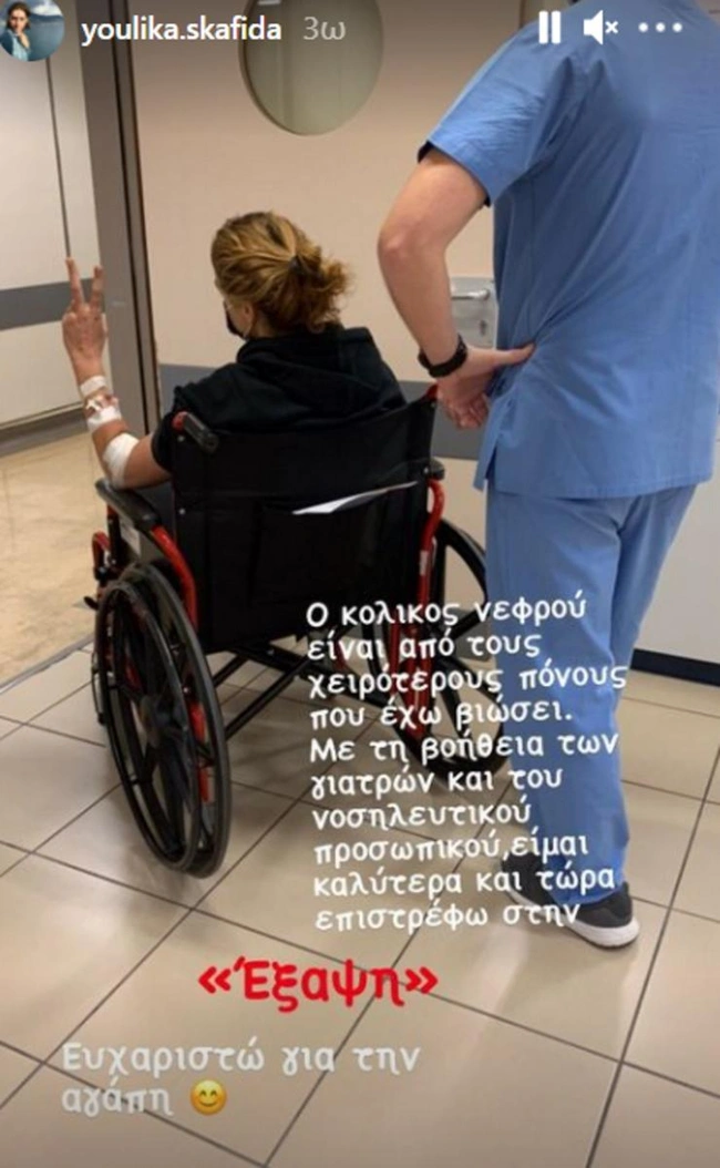 «Ο κολικός νεφρού είναι ένας από τους χειρότερους πόνους που έχω βιώσει. Με τη βοήθεια των γιατρών και του νοσηλευτικού προσωπικού, είμαι καλύτερα και τώρα επιστρέφω στην “Έξαψη”. Ευχαριστώ για την αγάπη».