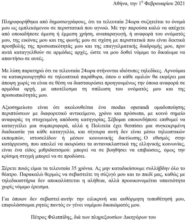 Ο γνωστός ηθοποιός και σκηνοθέτης Πέτρος Φιλιππίδης -επικαλούμενος πληροφορίες ότι ετοιμάζονται να τον εμπλέξουν σε «περιστατικά που αγνοεί»- εξέδωσε διά των πληρεξούσιων δικηγόρων του ανακοίνωση.