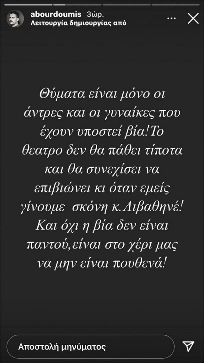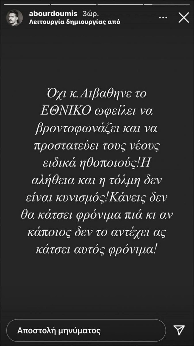 «Όχι κ. Λιβαθινέ, το ΕΘΝΙΚΟ ωφείλει να βροντοφωνάζει και να προστατεύει τους νέους ειδικά ηθοποιούς! Η αλήθεια και η τόλμη δεν είναι κυνισμός! Κανείς δεν θα κάτσει φρόνιμα πια κι αν κάποιος δεν το αντέχει, ας κάτσει αυτός φρόνιμα», πρόσθεσε σε νέο του story ο ηθοποιός.