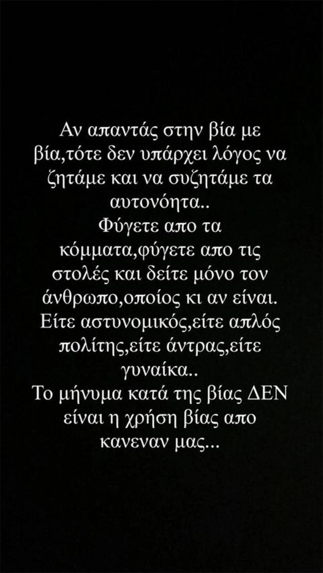 «Αν απαντάς στη βία με βία, τότε δεν υπάρχει λόγος να ζητάμε και να συζητάμε τα αυτονόητα. Φύγετε από τα κόμματα, φύγετε από τις στολές και δείτε μόνο τον άνθρωπο, όποιος κι αν είναι. Είτε αστυνομικός, είτε απλός πολίτης, είτε άντρας, είτε γυναίκα. Το μήνυμα κατά της βίας δεν είναι η χρήση βίας από κανέναν μας».