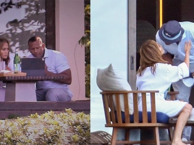 Βλέποντας τον αρραβωνιαστικό της να περνάει μέσα από τις συρόμενες γυάλινες πόρτες, η Τζένιφερ Λόπεζ φαίνεται να τον καλημερίζει με ένα φιλί. Ο Ροντρίγκες, πρώην επαγγελματίας παίκτης του μπέιζμπολ, το φορούσε μια μπλε μάσκα προσώπου μίας χρήσης.