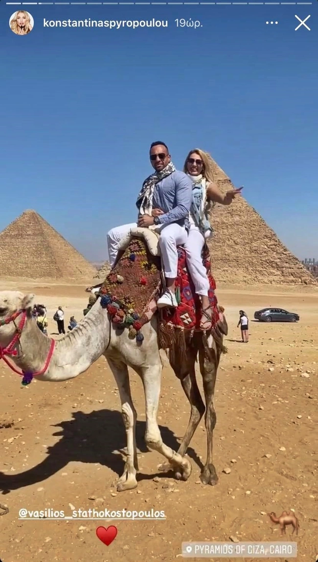 Μάλιστα η Κωνσταντίνα Σπυροπούλου δημοσίευσε και τις πρώτες της φωτογραφίες με τον αγαπημένο της μπροστά από τις πυραμίδες, πάνω σε καμήλα ενώ μοιράστηκε stories από το δείπνο σε ένα από τα πιο εντυπωσιακά εστιατόρια της περιοχής.