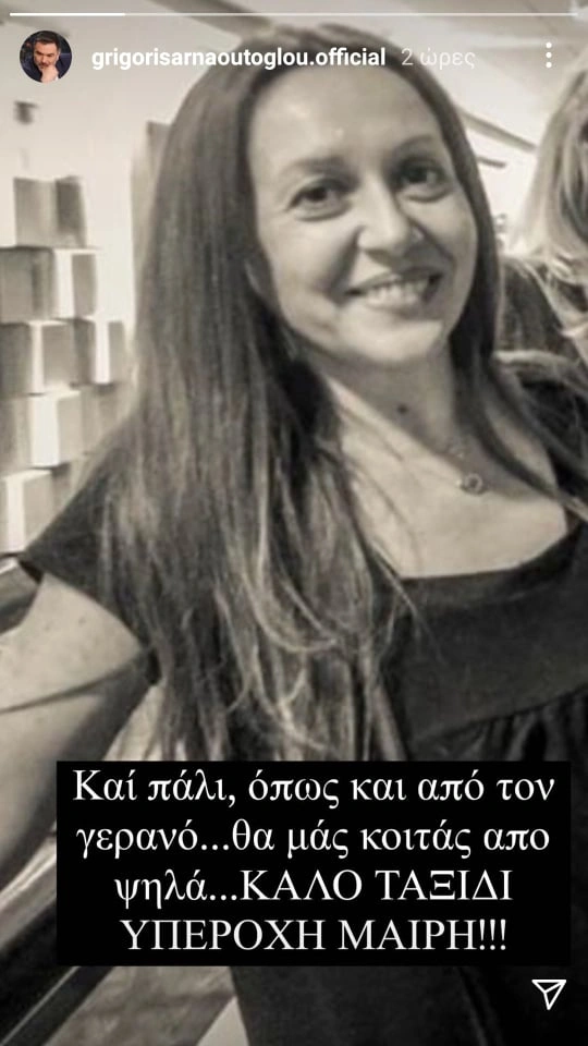 «Και πάλι, όπως κι από τον γερανό, θα μας κοιτάς από ψηλά. Καλό ταξίδι υπέροχη Μαίρη», έγραψε ο Γρηγόρης Αρναούτογλου.