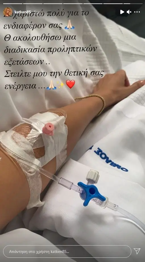 Η Κατερίνα Καινούργιου ανέβασε μια φωτογραφία στο instagram της μέσα από το νοσοκομείο και ευχαρίστησε τον κόσμο για τα μηνύματα αγάπης που της έστειλαν. «Ευχαριστώ πολύ για το ενδιαφέρον σας. θα ακολουθήσω μια διαδικασία προληπτικών εξετάσεων. Στείλτε μου τη θετική σας ενέργεια».