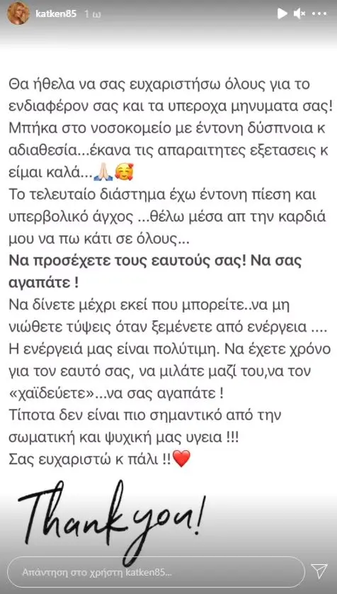 «Θα ήθελα να σας ευχαριστήσω όλους για το ενδιαφέρον σας και τα υπέροχα μηνύματά σας! Μπήκα στο νοσοκομείο με έντονη δύσπνοια και αδιαθεσία... έκανα τις απαραίτητες εξετάσεις και είμαι καλά. Το τελευταίο διάστημα έχω έντονη πίεση και υπερβολικό άγχος... θέλω μέσα απ την καρδιά μου να πω κάτι σε όλους... Να προσέχετε τους εαυτούς σας! Να σας αγαπάτε! Να δίνετε μέχρι εκεί που μπορείτε.. να μη νιώθετε τύψεις όταν ξεμένετε από ενέργεια... Η ενέργεια μας είναι πολύτιμη. Να έχετε χρόνο για τον εαυτό σας, να μιλάτε μαζί του, να τον “χαϊδεύετε”... να σας αγαπάτε! Τίποτα δεν είναι πιο σημαντικό από την σωματική και ψυχική μας υγεία!!! Σας ευχαριστώ και πάλι!! Thank you!».