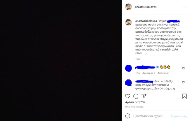 Ο Αναστάσης Κολοβός, ο τηλεοπτικός «Μάκης Ζούβας» από τη σειρά «Έλα στη θέση μου», φανερά εκνευρισμένος, ξέσπασε με μία ανάρτησή του στα social media για τις φωτογραφίες χρηστών από παραλίες ενώ μαίνονται τα πύρινα μέτωπα: «Για μια γ...... μέρα σαν αυτήν σας είναι τραγικά δύσκολο να μην ποστάρετε την ματαιοδοξία και τον ναρκισσισμό σας ποστάροντας φωτογραφίες απ' τις παραλίες πίνοντας παγωμένη μπύρα με το καινούριο σας μαγιό στα social media, ε; Δεν τα γράφω αυτά μέσα από πυροσβεστικό canadair αλλά έλεος».
