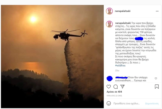 Η Νανά Παλαιτσάκη ξέσπασε μέσα από τον λογαριασμό της στο Instagram, τονίζοντας πως "την ώρα που βρέχει στάχτες" και η "Ελλάδα καίγεται" κάποιοι "ποζαρουν με κοκτέιλ, φορώντας 158 φίλτρα". «Είναι δυνατόν “φιλάνθρωποι της πόζας” αυτές τις μέρες να έχουν λουστεί την κτηνωδία της ματαιοδοξίας τους! Σε ποιο σκάφος θα κρυφτείς κακομοίρα μου όταν θα βρέχει δηλητήριο; Σε ποιο;» καταλήγει η Νανά Παλαιτσάκη.