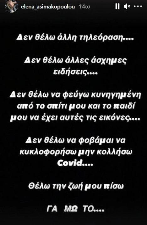 «Κουράστηκα… Ανέβηκαν τα κρούσματα στις 4.000. Εδώ και 8 μέρες καίγεται η μισή Ελλάδα. Η οικονομία πάει κατά διαόλου. Η κακία και η αγένεια ορισμένων ανθρώπων δεν περιγράφεται. ΚΟΥΡΑΣΤΗΚΑ. Δεν θέλω άλλη τηλεόραση. Δεν θέλω άλλες άσχημες ειδήσεις. Δεν θέλω να φεύγω κυνηγημένη από το σπίτι και το παιδί μου να έχεις αυτές τις εικόνες. Δεν θέλω να φοβάμαι να κυκλοφορήσω μην κολλήσω Covid. Θέλω τη ζωή μου πίσω. Έλεος», έγραψε χαρακτηριστικά η Έλενα Ασημακοπούλου.