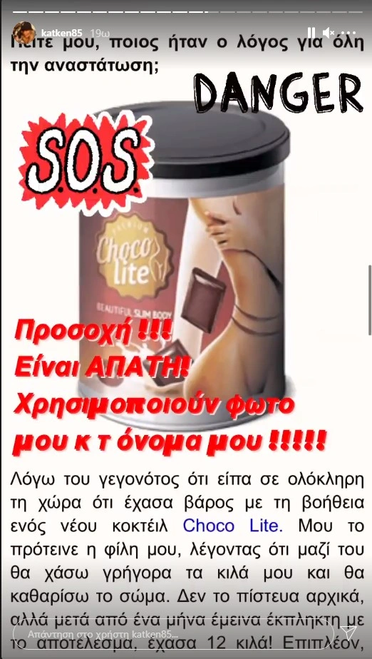«SOS, ψεύτικο! Δεν ισχύει τίποτα απ' όλα αυτά. Είναι απάτη. Κινούμαι άμεσα νομικά. Χρησιμοποιούν φώτο και το όνομά μου» έγραψε στην ανάρτηση που έκανε στο Instagram Story της.