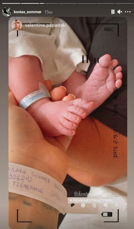 Η Βαλεντίνη Παπαδάκη λίγο μετά τη γέννηση του μωρού, έκανε ένα story για να ανακοινώσει τα ευχάριστα, το οποίο στη συνέχεια δημοσίευσε και ο Κώστας Σόμμερ. Πρόκειται για μία φωτογραφία με τα ποδαράκια του μωρού την ώρα που η μαμά του τα ακουμπάει με το χέρι της και ο Σόμμερ το κρατάει στην αγκαλιά του.