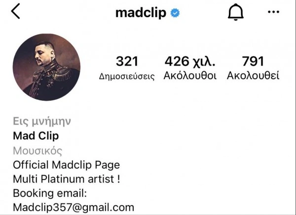Μάλιστα, αίσθηση έχει προκαλέσει και η αλλαγή που έχει γίνει στο προφίλ του δημοφιλούς τραγουδιστή στο Instagram. Συγκεκριμένα, πλέον κάτω από τη φωτογραφία του Mad Clip στο σημείο όπου αναγράφονται οι προσωπικές πληροφορίες υπάρχει η φράση: «Εις μνήμην».