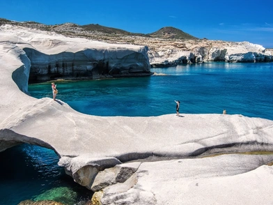 Τα καταγάλανα, κρυστάλλινα νερά της Μήλου και η διάσημη παραλία του Σαρακήνικου φυσικά κλέβουν τις εντυπώσεις στην καμπάνια του γαλλικού οίκου.