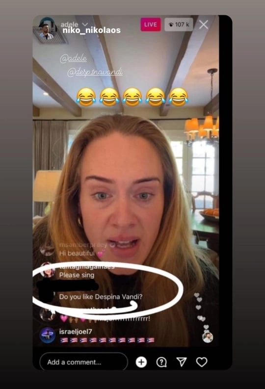 Πώς μπορεί να συνδεθεί το όνομα της Αντέλ με τη Δέσποινα Βανδή; Mέσω μια ερώτησης που δέχθηκε η Βρετανή τραγουδίστρια από θαυμαστή της στο live chat, που έκανε το βράδυ της Κυριακής (10/10) στο Instagram. Πιο συγκεκριμένα, την ώρα που η 33χρονη τραγουδίστρια έκανε live μετάδοση στον λογαριασμό της και απαντούσε στις ερωτήσεις του κόσμου, δέχθηκε μία απρόσμενη ερώτηση. «Σου αρέσει η Δέσποινα Βανδή;»