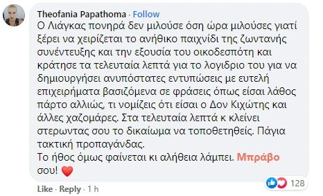 «Ο Λιάγκας πονηρά δεν μιλούσε όση ώρα μιλούσες, γιατί ξέρει να χειρίζεται το ανήθικο παιχνίδι της ζωντανής συνέντευξης και την εξουσία του οικοδεσπότη και κράτησε τα τελευταία λεπτά για το λογύδριο του για να δημιουργήσει ανυπόστατες εντυπώσεις με ευτελή επιχειρήματα, βασιζόμενα σε φράσεις όπως είσαι λάθος πάρτο αλλιώς, τι νομίζεις ότι είσαι ο Δον Κιχώτης και άλλες χαζομάρες. Στα τελευταία λεπτά. Και κλείνει στερώντας σου το δικαίωμα να τοποθετηθείς. Πάγια τακτική προπαγάνδας. Το ήθος όμως φαίνεται κaι αλήθεια λάμπει. Μπράβο σου!», έγραψε η Θεοφανία Παπαθωμά.