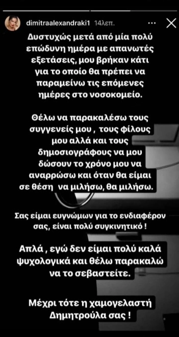 Το πρωί της Πέμπτης, το γνωστό μοντέλο επανήλθε με νέα ανάρτηση στο Instagram, στην οποία αποκαλύπτει ότι θα μείνει περισσότερες μέρες στο νοσοκομείο ζητώντας μάλιστα χρόνο να αναρρώσει για να μιλήσει για αυτό που της συμβαίνει όταν νιώσει καλύτερα.«Δυστυχώς μετά από μια πολύ επώδυνη ημέρα με απανωτές εξετάσεις, μου βρήκαν κάτι για το οποίο θα πρέπει να παραμείνω τις επόμενες ημέρες στο νοσοκομείο. Θέλω να παρακαλέσω τους συγγενείς μου, τους φίλους αλλά και τους δημοσιογράφου να μου δώσουν τον χρόνο μου να αναρρώσω και όταν θα είμαι σε θέση να μιλήσω θα μιλήσω. Σας είμαι ευγνώμων για το ενδιαφέρον σας, είναι συγκινητικό. Απλά, εγώ δεν είμαι πολύ καλά ψυχολογικά και θέλω σας παρακαλώ να το σεβαστείτε. Μέχρι τότε, η χαμογελαστή Δημητρούλα σας», έγραψε η Δήμητρα Αλεξανδράκη.