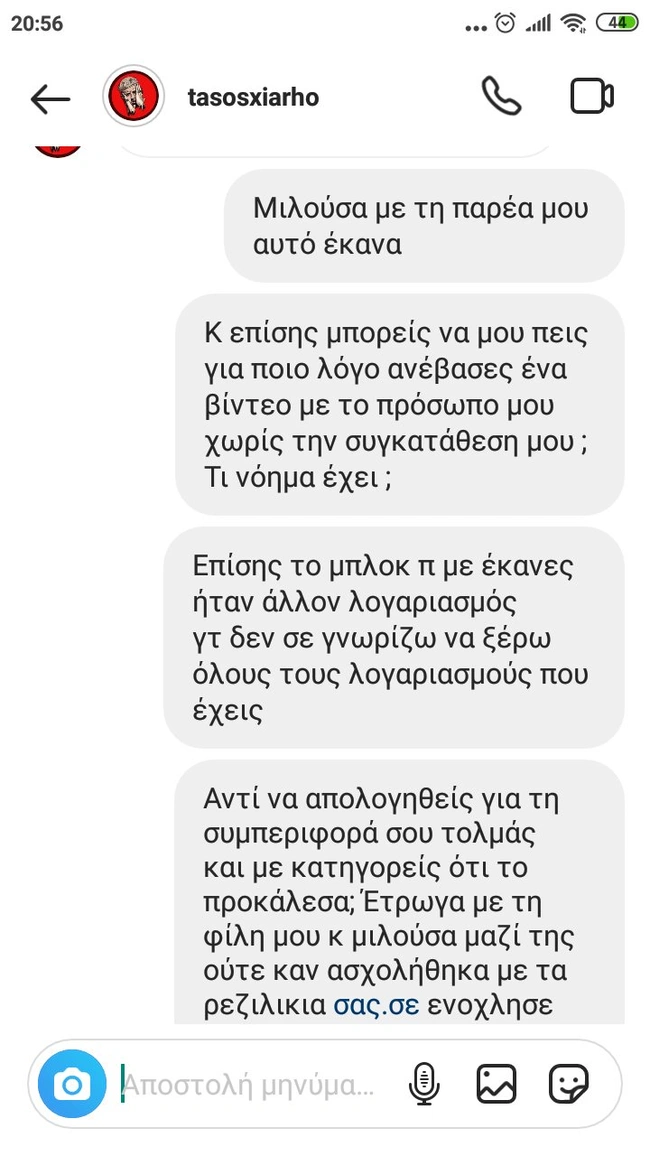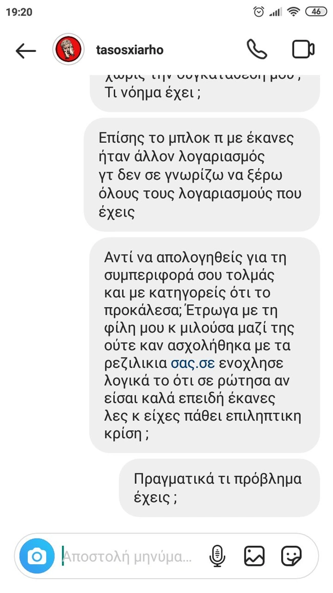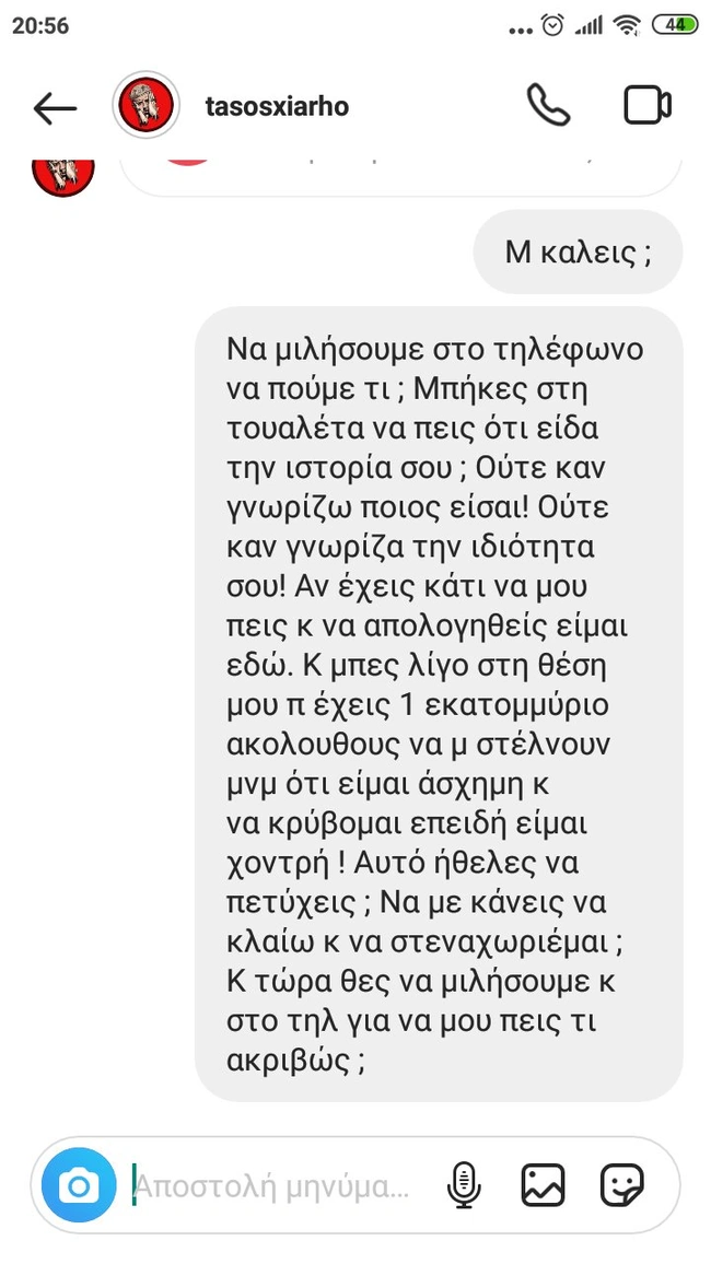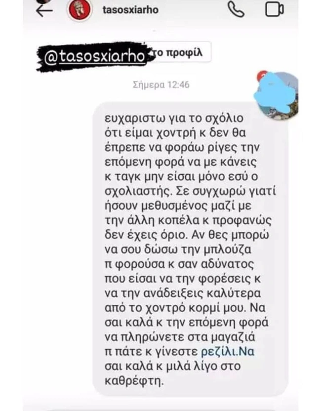 Ο Τάσος Ξιαρχό, αντί να σκύψει το κεφάλι και να μαζέψει την άθλια συμπεριφορά του, όντας το δημόσιο πρόσωπο που ο ίδιος επέλεξε να είναι, προτίμησε να πει στην κοπέλα που του έστειλε μήνυμα στα social media για να τον ρωτήσει γιατί την εξέθεσε έτσι, να του ζητήσει εκείνη συγγνώμη (!) αντί να το πράξει ο ίδιος!