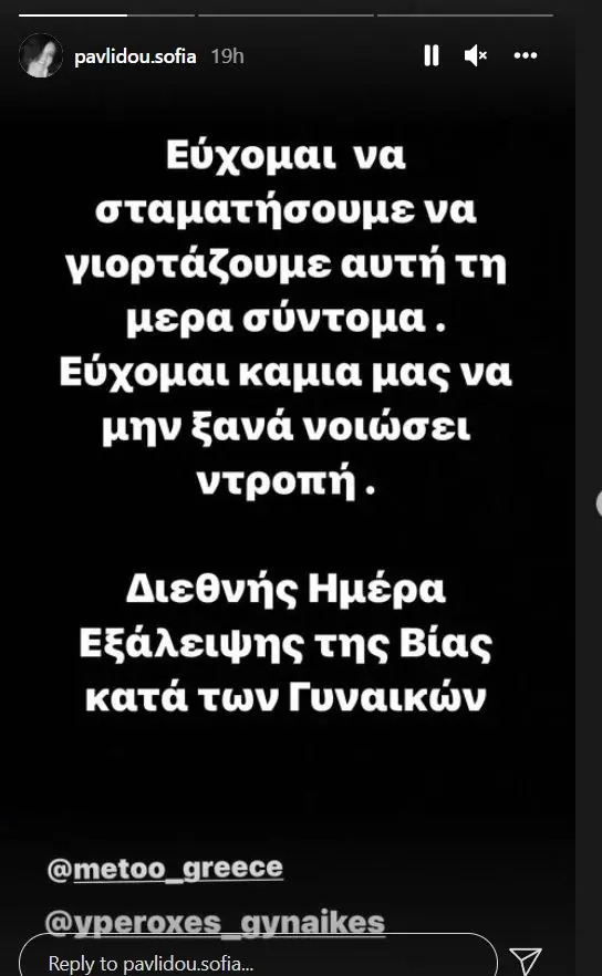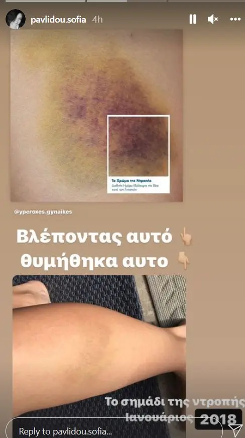 Τα σημάδια στο σώμα της, μετά την κακοποίηση που υπέστη, σύμφωνα με την καταγγελία της, από τον συνάδελφό της, Μάνο Παπαγιάννη, έδωσε στη δημοσιότητα και η ηθοποιός Σοφία Παυλίδου. Τον Ιανουάριο του 2018, μερικές ατάκες ήταν η αιτία να έρθουν σε ρήξη στα καμαρίνια μετά το τέλος της παράστασης, η ηθοποιός, Σοφία Παυλίδου και ο Μάνος Παπαγιάννης.