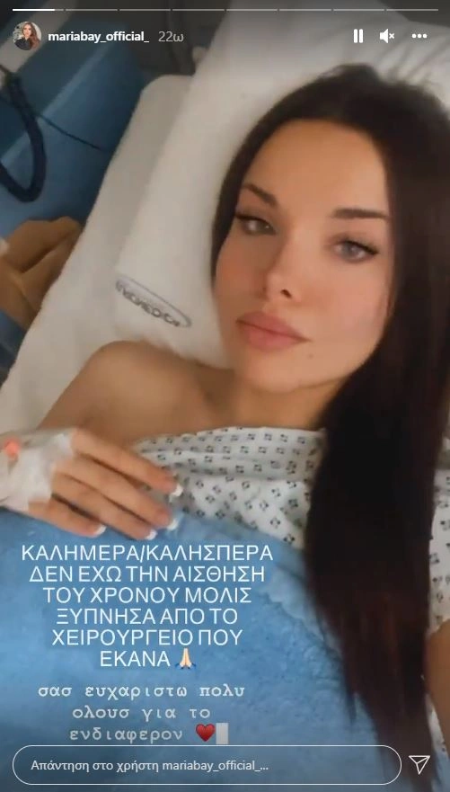 Η Μαρία Μπέη ενημέρωσε τους followers της στο Instagram για την κατάστασή της μέσω stories που ανέβασε στο προφίλ της. Στο πρώτο story έγραψε: «Καλημέρα/ Καλησπέρα δεν έχω την αίσθηση του χρόνου. Μόλις ξύπνησα από το χειρουργείο που έκανα. Σας ευχαριστώ πολύ όλους για το ενδιαφέρον».