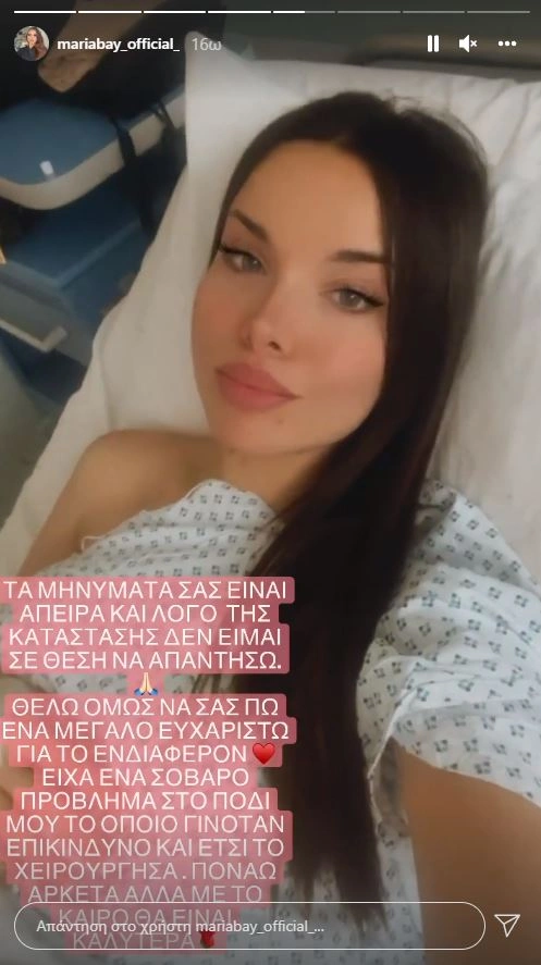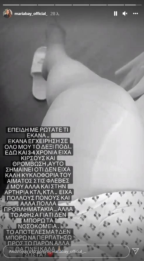 Στη συνέχεια η πρώην παίκτρια του MasterChef ανέβασε νεότερο story όπου εξήγησε αναλυτικά ποιο ήταν το πρόβλημα της υγείας της: «Επειδή με ρωτάτε τι έκανα… Έκανα εγχείρηση σε όλο μου το δεξί πόδι. Εδώ και 3-4 χρόνια είχα κιρσούς και θρόμβωση. Αυτό σημαίνει ότι δεν είχα καλή κυκλοφορία του αίματος στις φλέβες μου, αλλά και στην αρτηρία κτλ κλτ. Είχα πολλούς πόνους και άλλα πολλά προβληματάκια, αλλά το άφησα γιατί δεν μπορώ τα νοσοκομεία. Το αποτέλεσμα; Δεν μπορώ να περπατήσω προς το παρόν, αλλά θα γίνει καλά, σωστά;», έγραψε η Μαρία Μπέη.