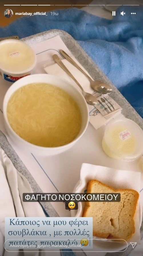 Νωρίτερα και με αφορμή το φαγητό του νοσοκομείου που δεν της άρεσε, έδειξε πως δε χάνει το χιούμορ της ούτε αυτές τις στιγμές, ανεβάζοντας σε στόρι την παρακάτω φωτογραφία.