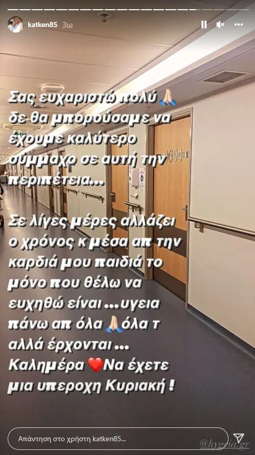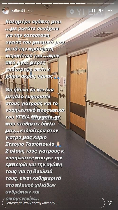 «Καλημέρα αγάπες μου. Με ρωτάτε συνέχεια για την κατάσταση υγείας του μπαμπά μου μετά την πρόσφατη περιπέτεια του... Πριν από λίγες ημέρες επέστρεψε σπίτι και χαίρει άκρας υγείας. Θα ήθελα να πω ένα τεράστιο ευχαριστώ στους γιατρούς και το νοσηλευτικό προσωπικό του Υγεία που στάθηκαν δίπλα μας… Σε λίγες μέρες αλλάζει ο χρόνος και μέσα από την καρδιά μου παιδιά το μόνο που θέλω να ευχηθώ είναι υγεία πάνω από όλα. Όλα τα άλλα έρχονται. Καλημέρα, να έχετε μια υπέροχη Κυριακή».