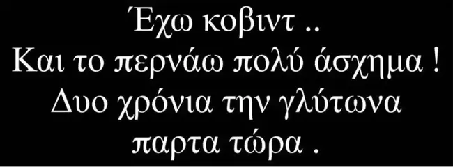 Συγκεκριμένα, η Super Κική αποκάλυψε το απόγευμα της Δευτέρας πως διαγνώσθηκε κι εκείνη με κορονοϊό, δημοσιεύοντας μια φωτογραφία όπου έγραψε: «Έχω κόβιντ και το περνάω πολύ άσχημα. Δύο χρόνια τη γλίτωνα, πάρτα τώρα».